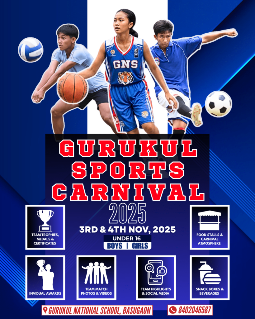 Gurukul National School, Basugaon is proud to announce the Gurukul Sports Carnival 2025, a two-day celebration of talent, teamwork, and sportsmanship. The event will be held on 3rd and 4th November 2025 at the school campus.